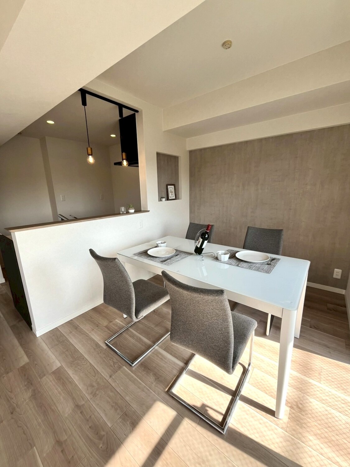 内装は明るい木目のフローリングと落ち着いたアクセントクロスを組み合わせ、