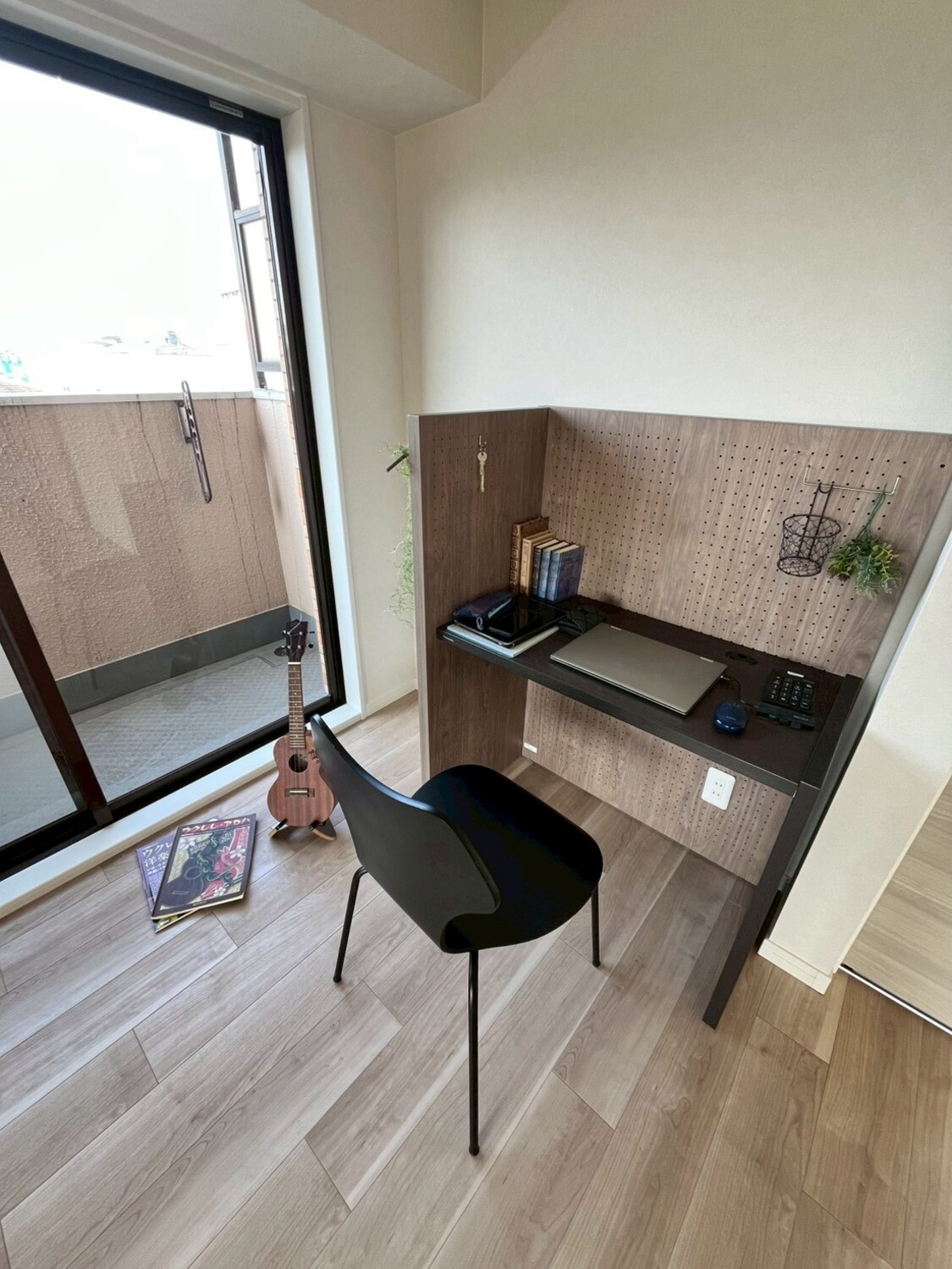 壁面の有孔ボードやコンパクトなデスクスペースにより、