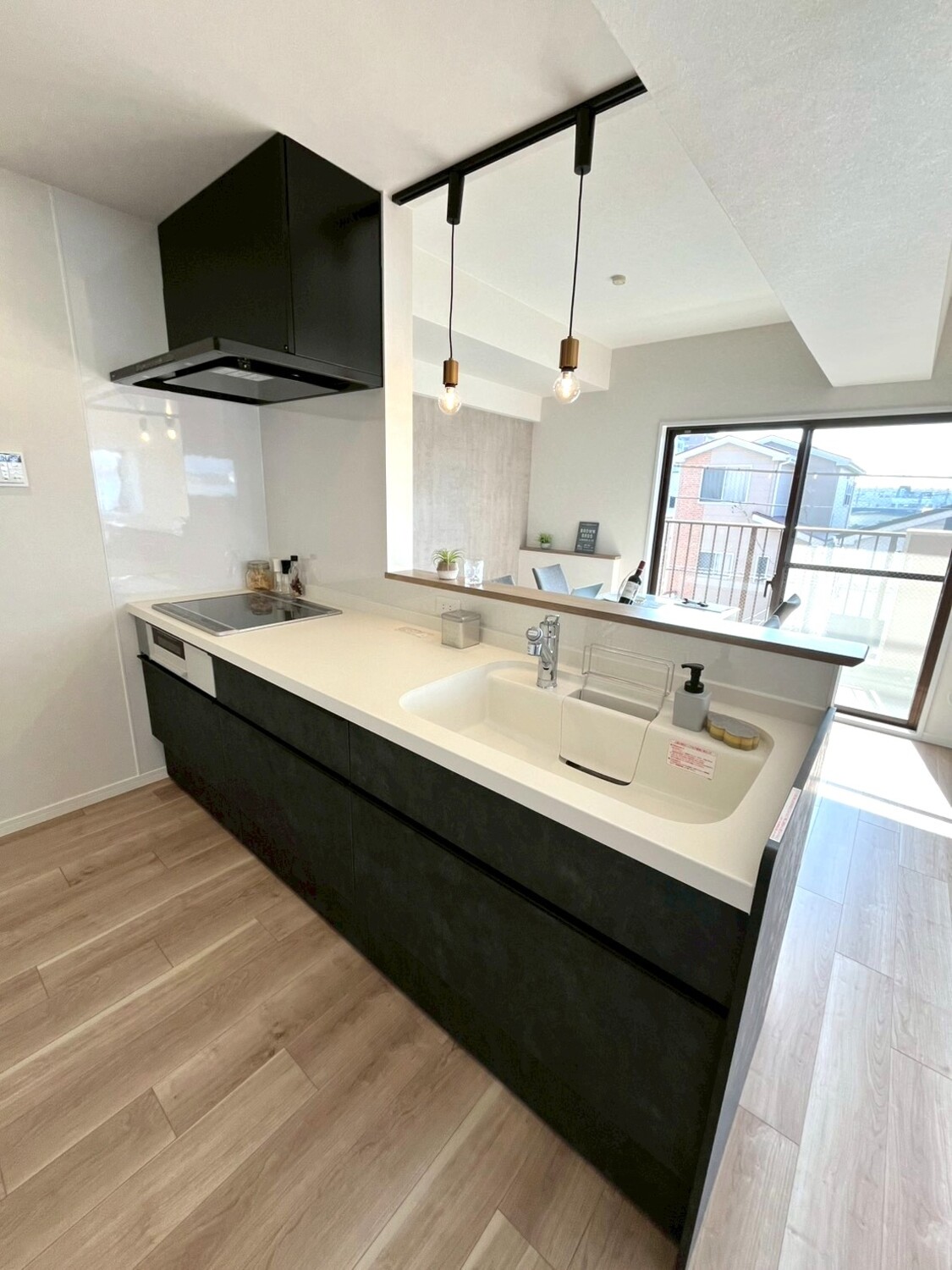 明るいフローリングと自然光が映える大人モダンなキッチン空間に仕上がりました。
