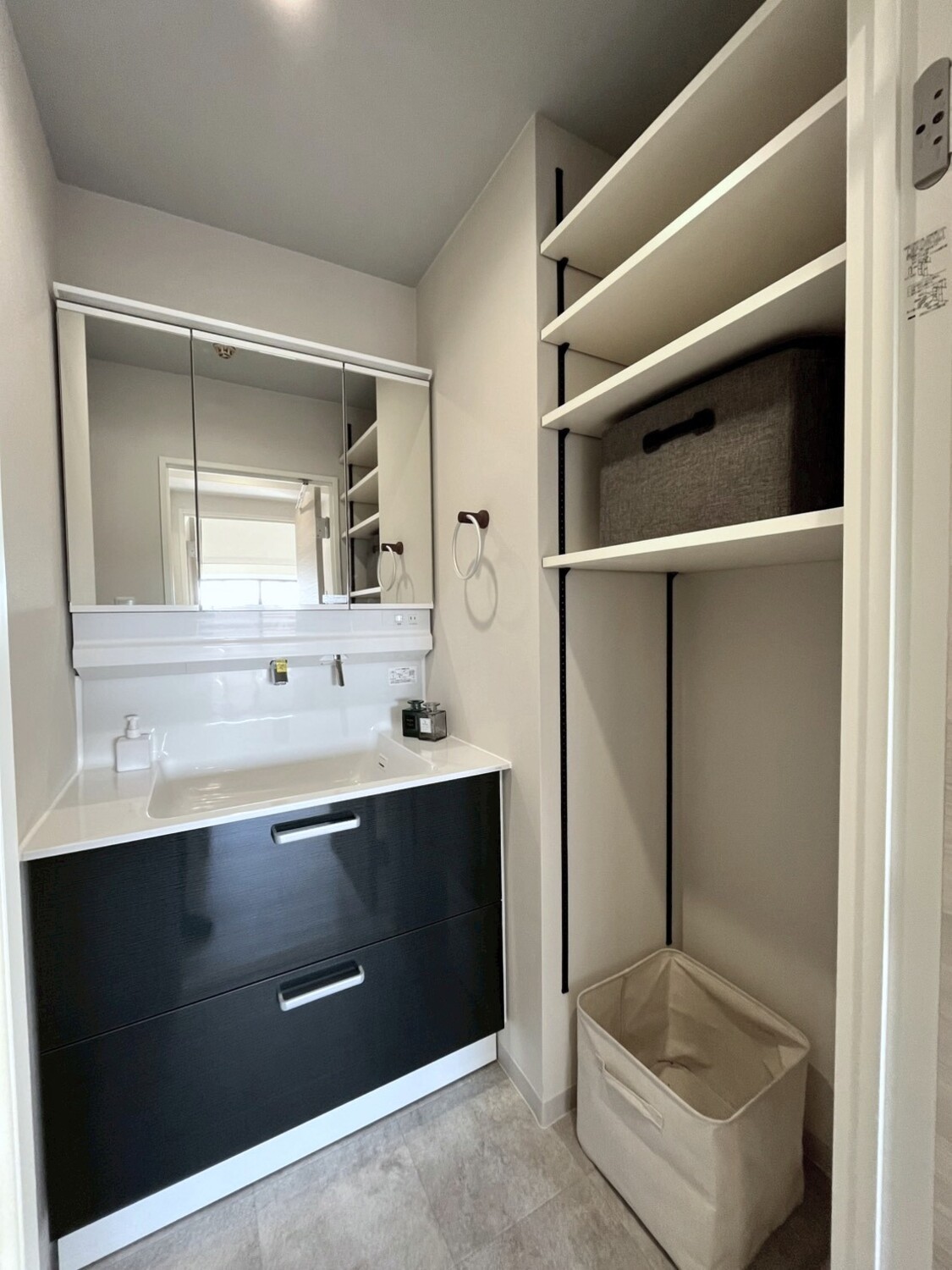 横には可動棚を設けることでタオルや日用品の収納スペースも確保。